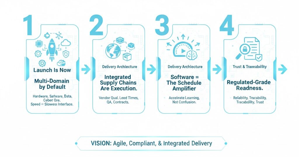 • Across space programs and space-adjacent initiatives—satellite-enabled services, advanced manufacturing, launch supply chains, mission operations, ground systems, and data commercialization—timelines stretch for reasons that are organizational, not purely technical.