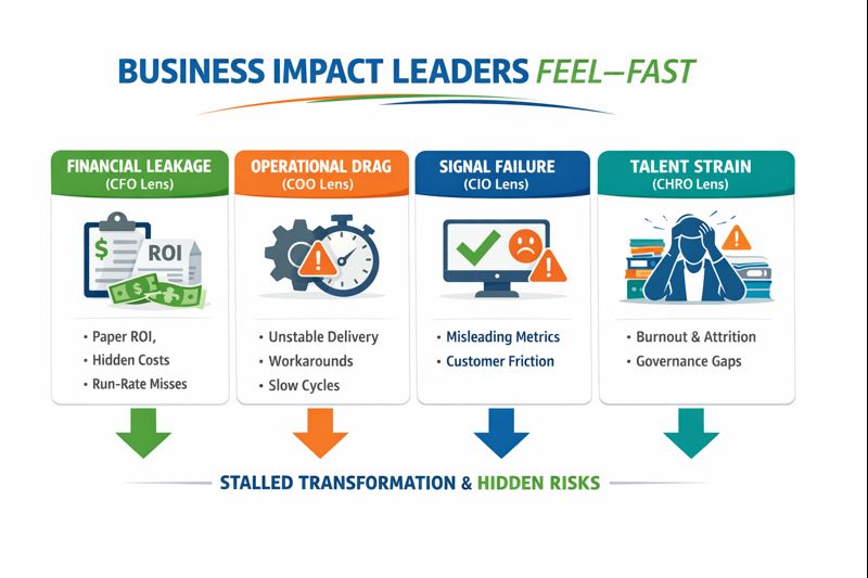 CapEx-heavy transformations generate paper ROI that depends on behaviours no one funded. Savings appear in models but don’t materialize in run-rate results. Meanwhile, hidden OpEx accumulates through contractors, rework, and workaround-heavy operations—just without transparency.